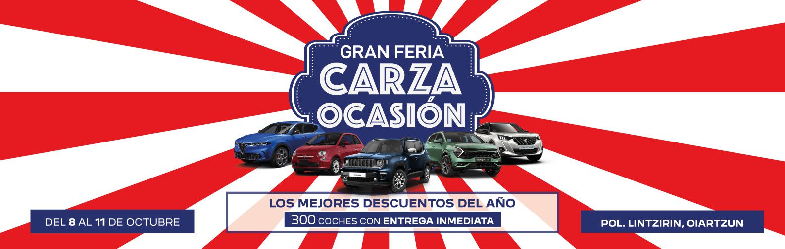 Del 8 al 11 de octubre, te esperamos en nuestra gran FERIA CARZA OCASIÓN en el Polígono Lintzirin de Oiartzun, donde encontrarás los mejores descuentos del año en una amplia selección de vehículos seminuevos, KM0 y ocasión.